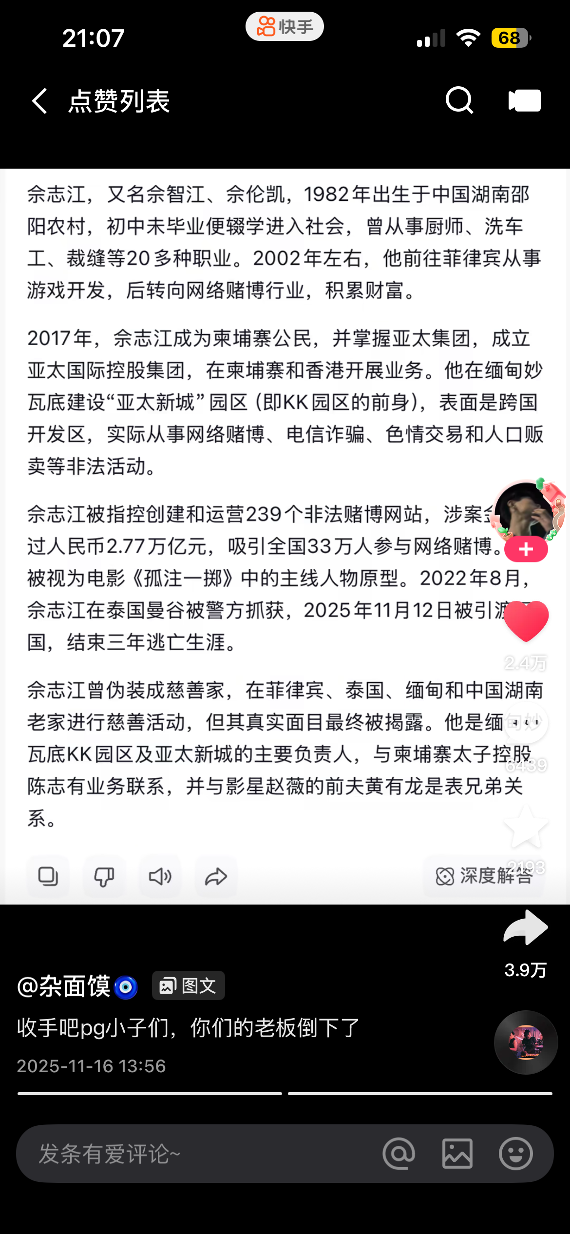 幕后老板都被抓了还玩个鸡巴 支持共产党枪毙这个狗日的 天天卡胡卡夺宝 空转 不知道吃了多少人血馒头 害的多少人家破人亡妻离子散 这下看共产党的子弹卡不卡