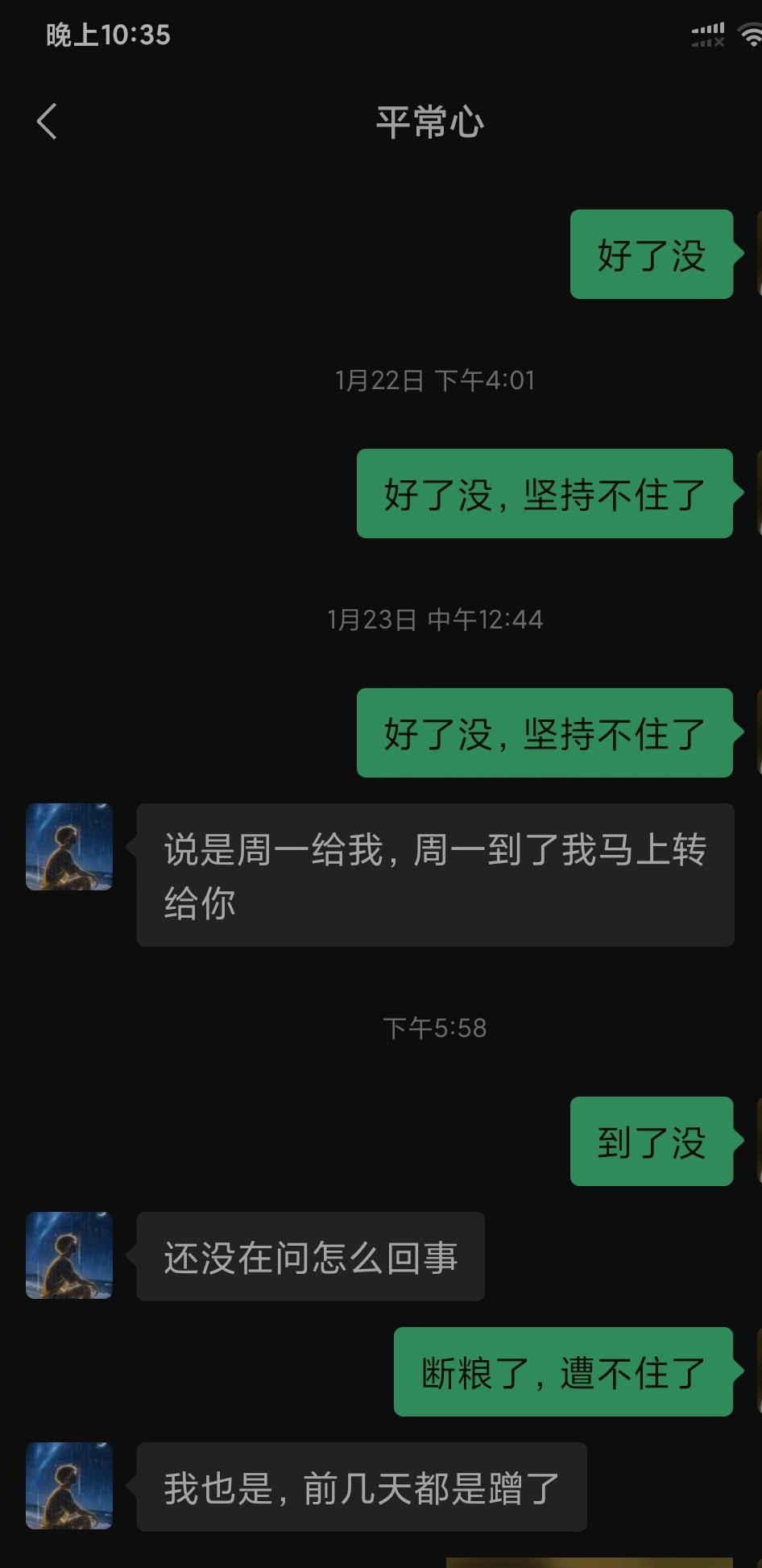 依旧没还,他真的打算还吗?理论上工资已经发了的。不还为什么不删,憋半天蹦一句出来。