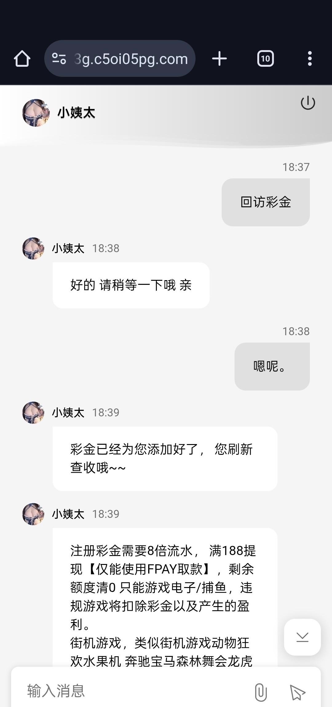 有账号登录后找客服申请回访彩金。就提供了账号也没查手机 送了18彩金  满188提款 只能指定钱包提款。(我因为有账号发的是回访彩金,客服回复的是注册彩金)老哥们碰瓷看着来。