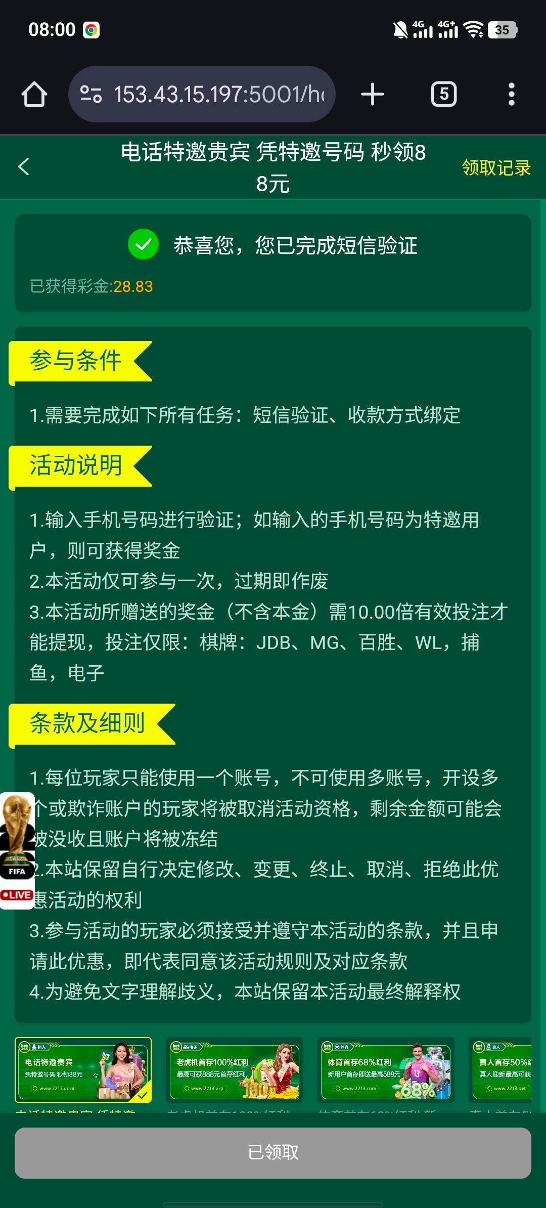 注册账号 下载App验证号码 是否特邀 最低派送28彩金  需要完成280流水才可以提现 我领了 2个号