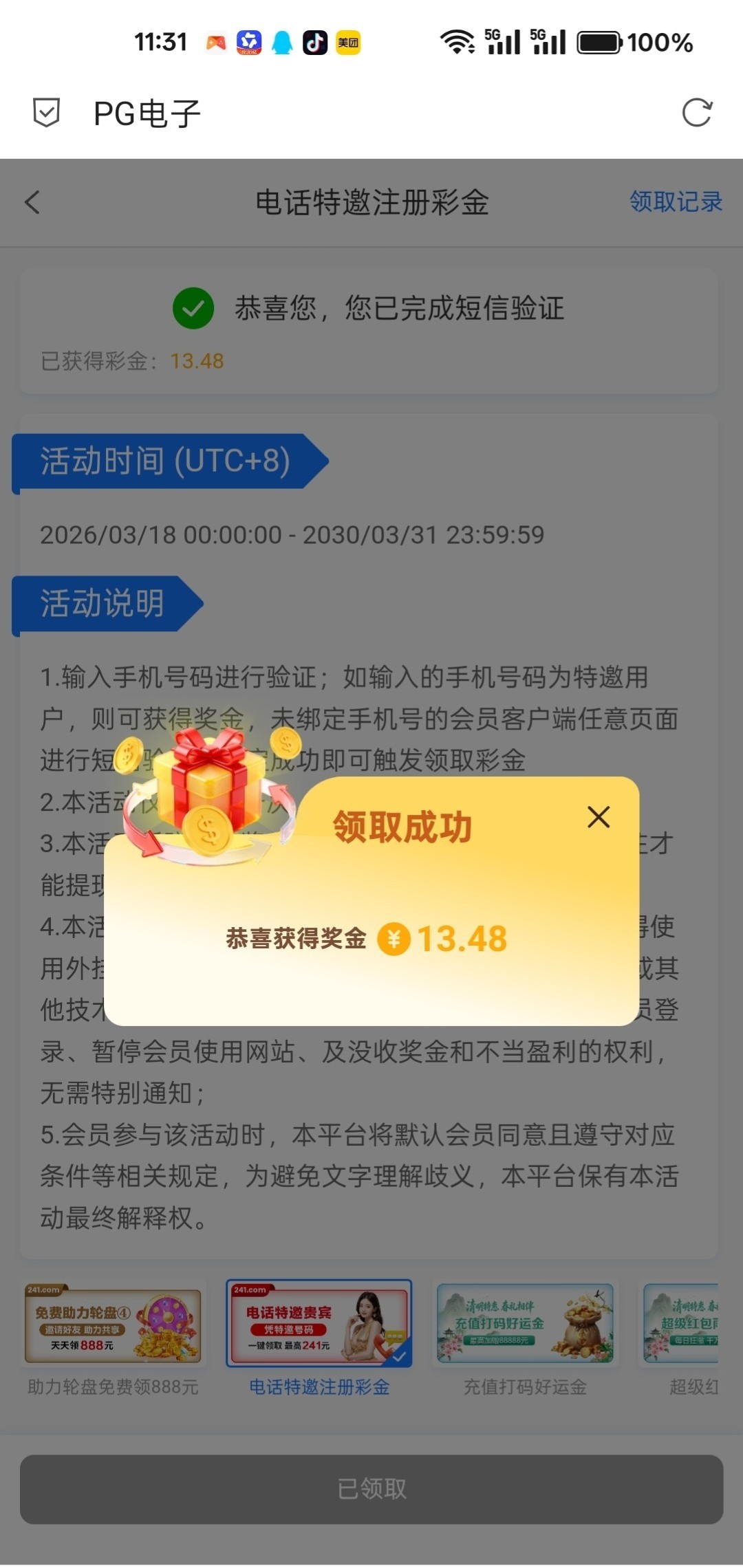 注册绑定个钱包,优惠里面有特邀手机号短信领取,出款自测